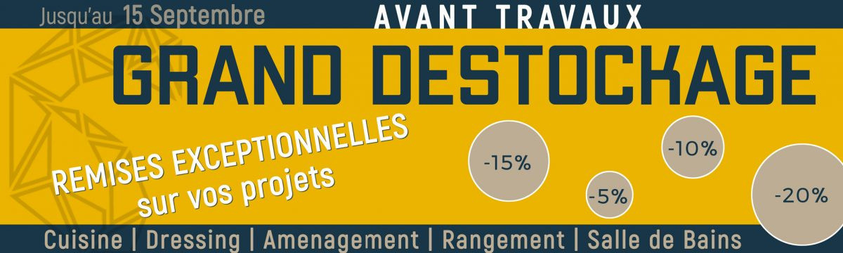 Du 15 Août au 15 Septembre 2020, retrouvez le GRAND DESTOCKAGE avant travaux. N'hésitez pas à nous retrouver au magasin : CUISINES , DRESSINGS, LIT RELEVABLE, FAÇADES...